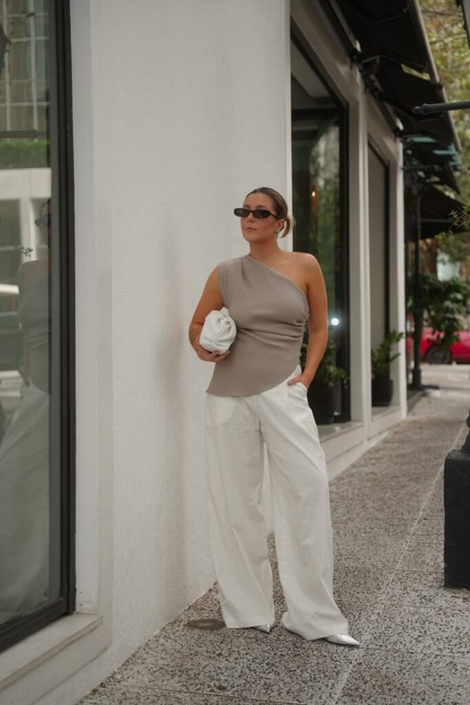 A refined neutral one-shoulder top lays the foundation for this effortlessly polished look, bringing a sense of sculptural elegance with its asymmetrical neckline. Flowing white wide-leg trousers enhance the streamlined aesthetic, creating a crisp and airy silhouette that feels both modern and timeless.