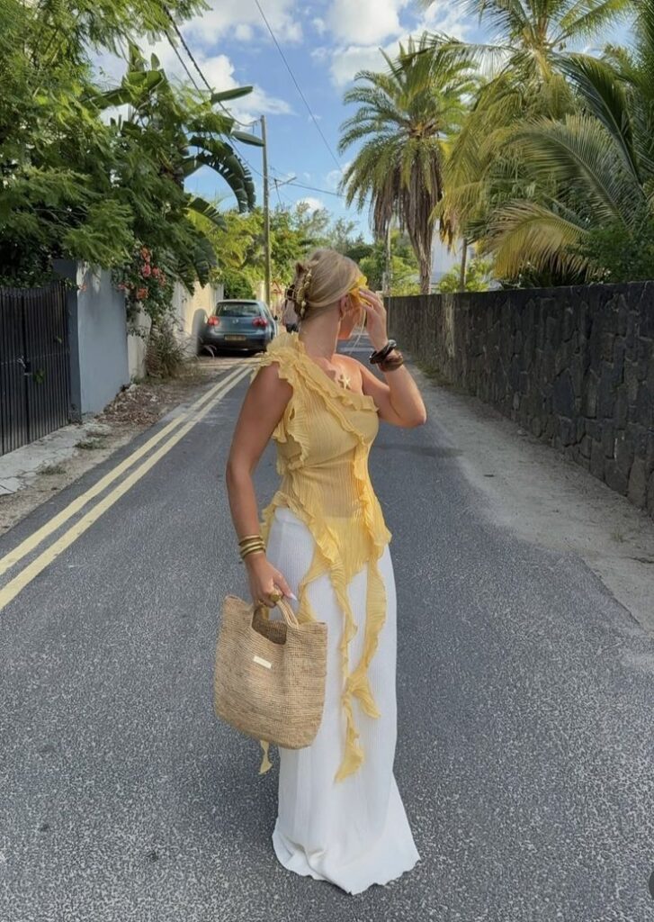 A dreamy, sculptural one-shoulder yellow top steals the spotlight with its artful ruffles cascading down in a whimsical, flowing pattern, adding gorgeous dimension and movement. Styled with a long white ribbed skirt, the look feels breezy and island-ready, exuding an effortless vacation glamour.