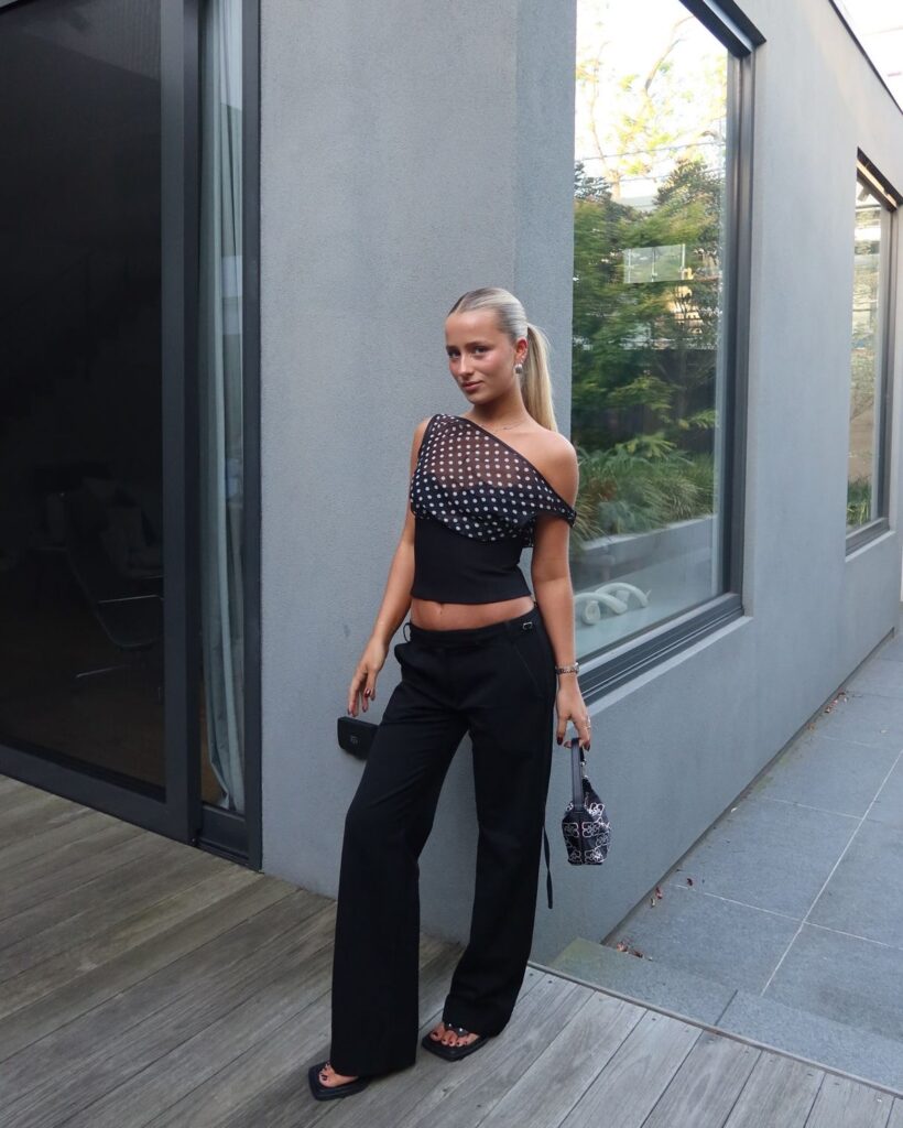 A modern one-shoulder top takes center stage here, featuring a sheer mesh layer with a chic polka dot pattern that drapes effortlessly across the neckline. The asymmetric design is balanced by sleek, tailored black trousers with a relaxed, wide-leg cut, creating a confident, polished silhouette.