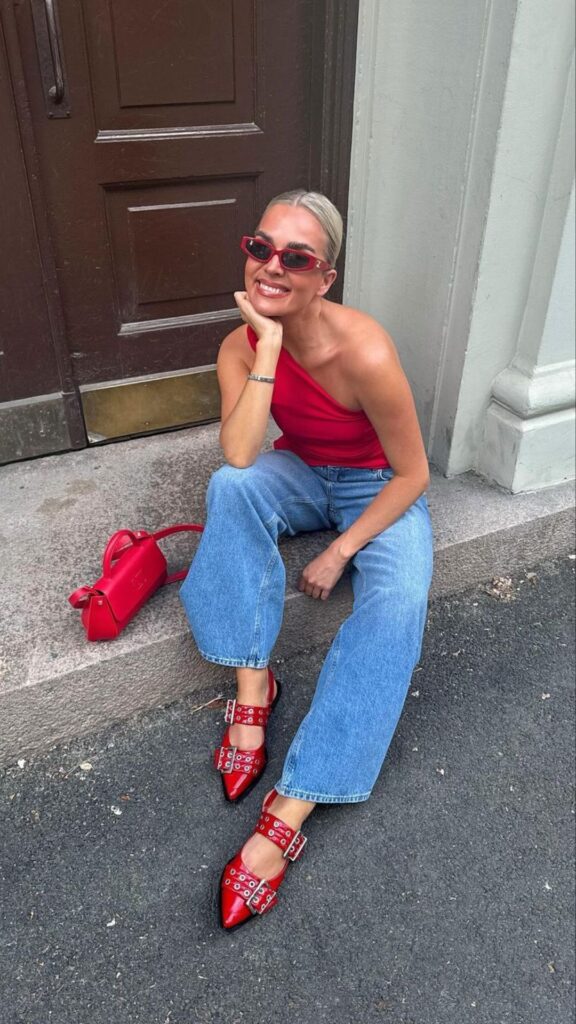 Red statement heels with buckle detailing, a matching red mini bag, and coordinating sunglasses turn the color story into a standout moment. With slicked-back hair and a confident attitude, this outfit feels playful yet put-together, delivering effortless city-cool energy.