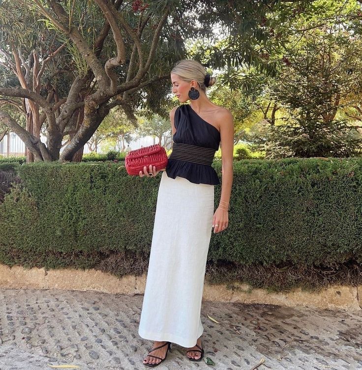 This one-shoulder peplum black top brings an elegant twist to a simple linen column skirt, striking the perfect balance of polish and softness. The cinched waist adds definition and flatters the silhouette, while minimalist black sandals keep the look grounded and breezy.