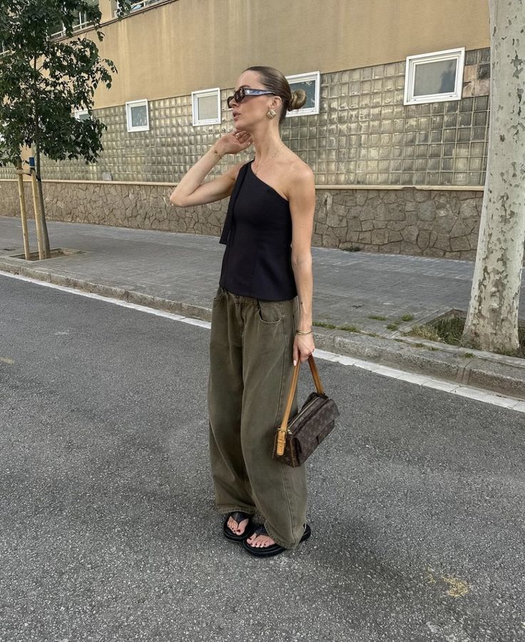 A sleek one-shoulder black top paired with slouchy olive cargo pants brings a relaxed yet sophisticated vibe to city dressing. The wide-leg silhouette balances the asymmetric neckline, while chunky black flip-flops add a carefree, off-duty twist.