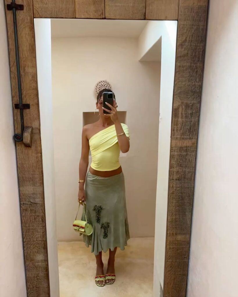 There’s something undeniably fresh about pairing a pale yellow one-shoulder top with a breezy sage green midi skirt adorned with subtle palm-like embellishments. Coordinating woven slides and a matching mini handbag bring a playful note to the look while keeping it cohesive and easygoing.