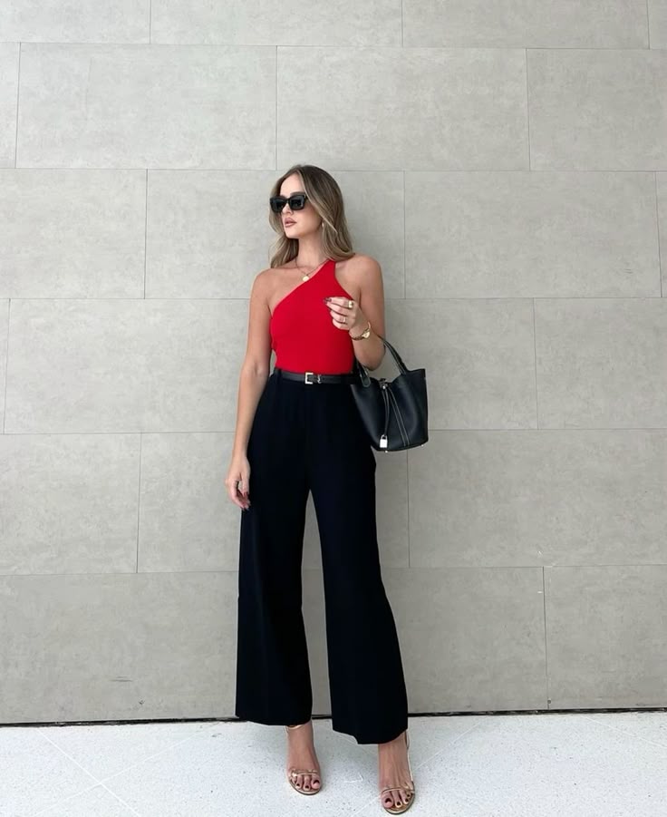 Here, a striking red one-shoulder top brings instant boldness and drama to a pair of classic high-waisted black trousers, creating a silhouette that feels refined yet powerful. The belted waist accentuates the shape beautifully, while the wide-leg cut balances the boldness of the top with a sophisticated flow.