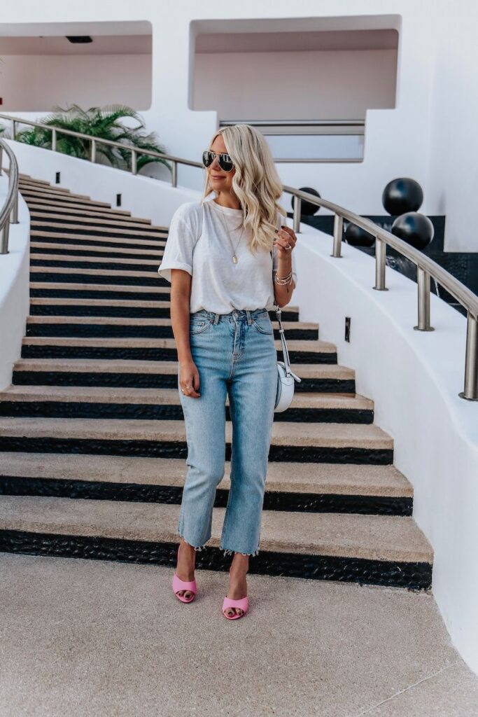 Pink shoes might seem daring, but they actually create one of the most charming and feminine looks when paired with jeans and a white tee. This unexpected color choice shows confidence while maintaining a playful, approachable vibe.