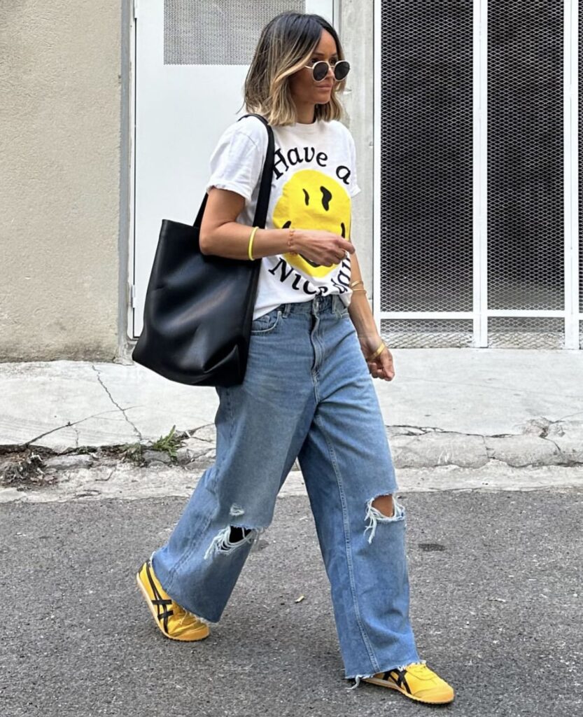 Yellow footwear brings instant sunshine and joy to your wardrobe, transforming the simple jeans-and-tee combo into something unexpectedly delightful. This bold color choice shows personality while remaining surprisingly versatile and wearable.