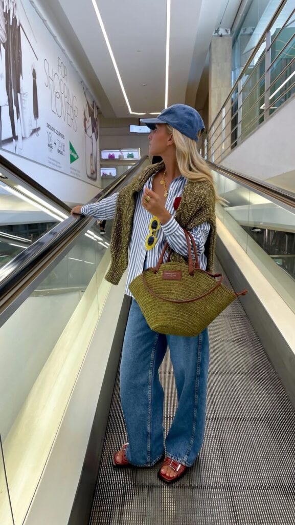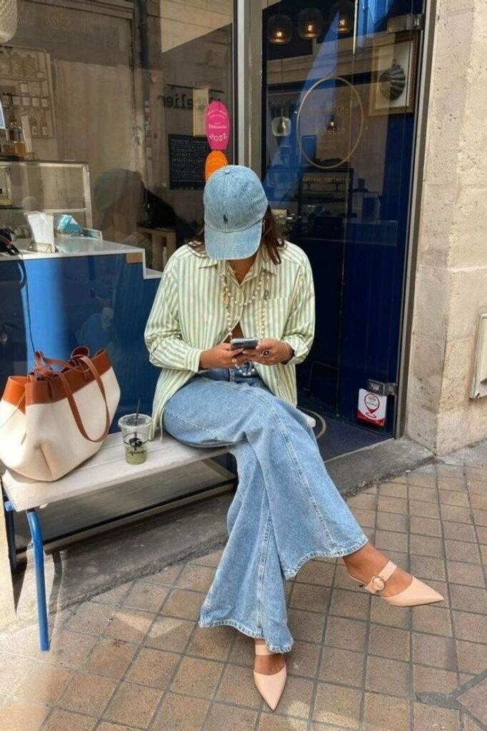 The striped button-down and wide-leg denim keep the look grounded in casual ease, and the denim cap finishes off the ensemble with an effortless cool. This shoe-and-bag combo is ideal for weekend strolling through the city or sitting at your favorite café with a matcha latte in hand.