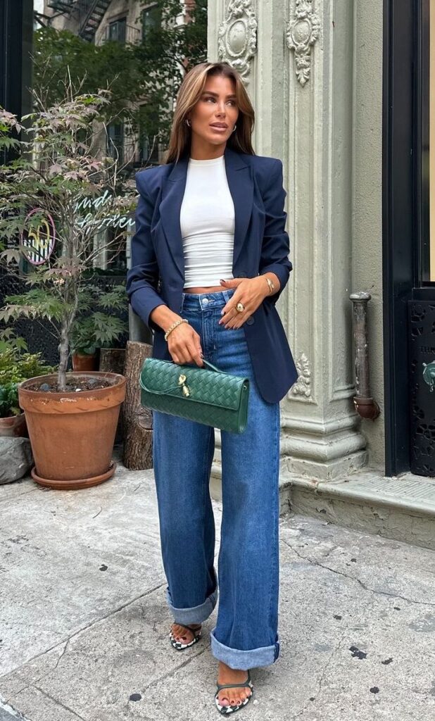 Blending business and ease, this ensemble delivers the perfect mix of structure and relaxation. A tailored navy blazer adds sharp sophistication over a simple white fitted tank, creating a crisp contrast that never fails. Paired with wide-leg cuffed denim jeans, the look leans effortlessly casual while remaining polished.