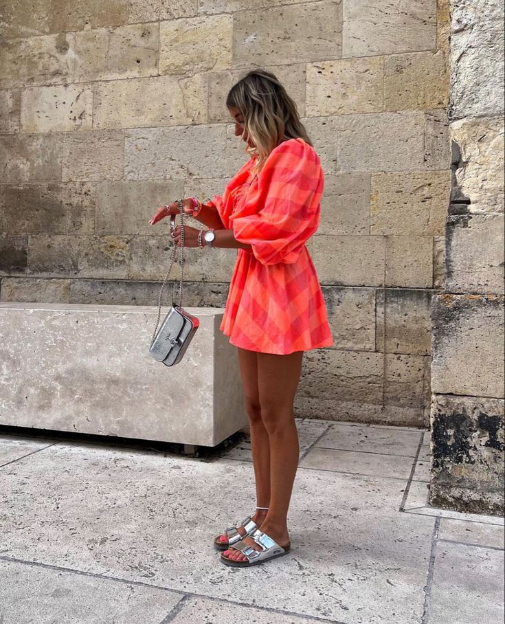 Grounding the playful vibe are classic metallic Birkenstock sandals, providing all-day comfort while keeping the outfit chic. The silver mini crossbody bag adds a polished touch, effortlessly tying the metallic accents together. Ideal for sunny strolls or a relaxed brunch date, this ensemble radiates joyful, carefree summer energy.