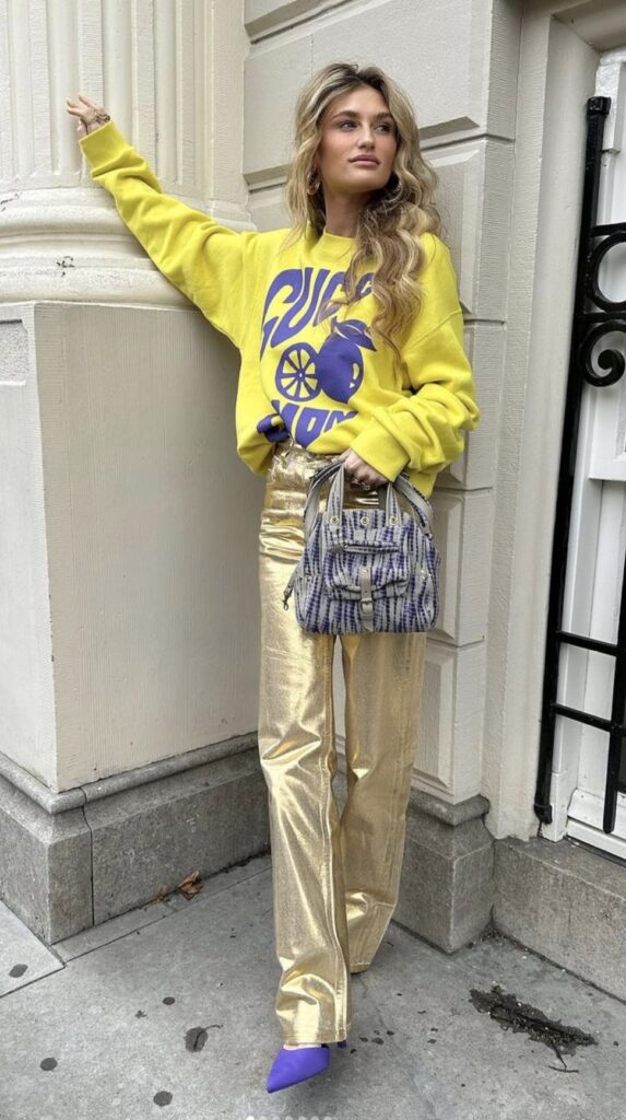 Bold and unapologetic, this outfit is a masterclass in high-energy color mixing. The bright yellow graphic sweatshirt delivers a fun, casual vibe, while the metallic gold pants dial up the drama with their luxe sheen.