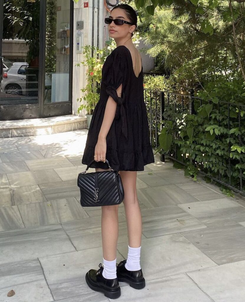 The soft, flowy black dress adds a feminine contrast to the sturdy footwear, while the white socks introduce a playful, street-style edge. Together, the shoes and bag offer a balanced look that feels polished without trying too hard—perfect for city strolls, brunch dates, or gallery visits.