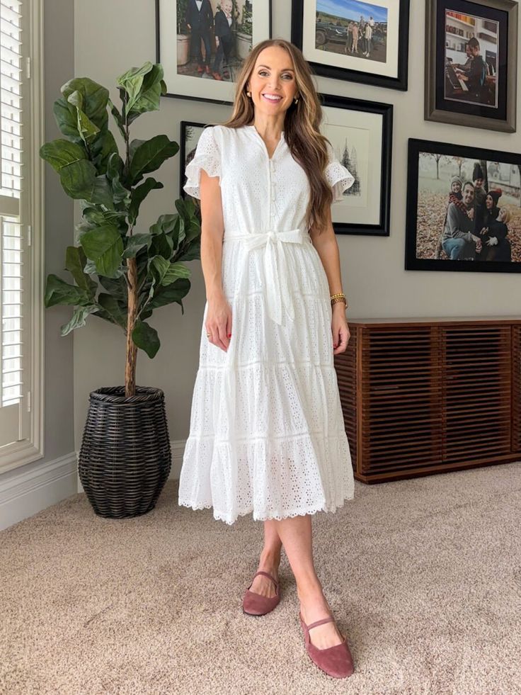 Delicate and timeless, this white eyelet midi dress delivers the kind of elegance that doesn’t try too hard. With flutter sleeves, a tie waist, and scalloped hem, it’s a go-to for garden parties, brunches, or summer strolls. Instead of stilettos, the look is grounded with soft burgundy Mary Jane flats—bringing just enough contrast while keeping the outfit approachable and comfy.