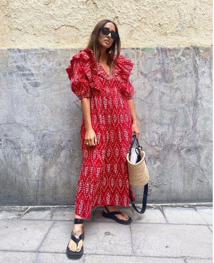 Drama meets downtown ease in this standout red maxi dress featuring voluminous puff sleeves and an intricate white motif. The bold silhouette could easily call for elevated shoes—but here, platform flip-flops shift the mood into effortless cool.