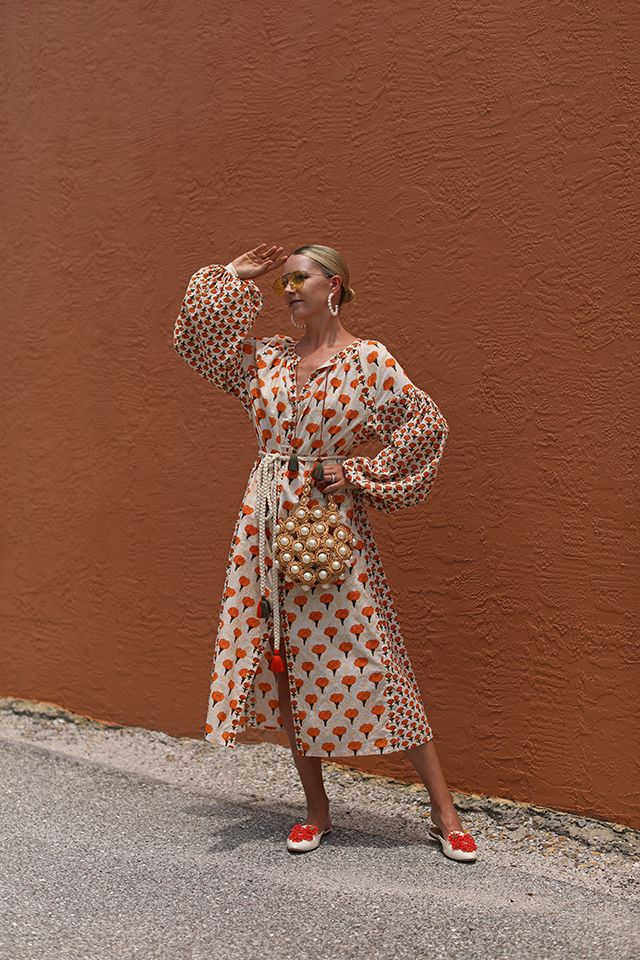 This vibrant summer dress makes a joyful impact with its bold orange tree-print motif and voluminous balloon sleeves. The lightweight fabric and relaxed silhouette offer both comfort and elegance, cinched at the waist with a tasseled rope belt for subtle shape. Coordinating flat mules in white with vivid red detailing echo the playful palette while ensuring all-day ease.