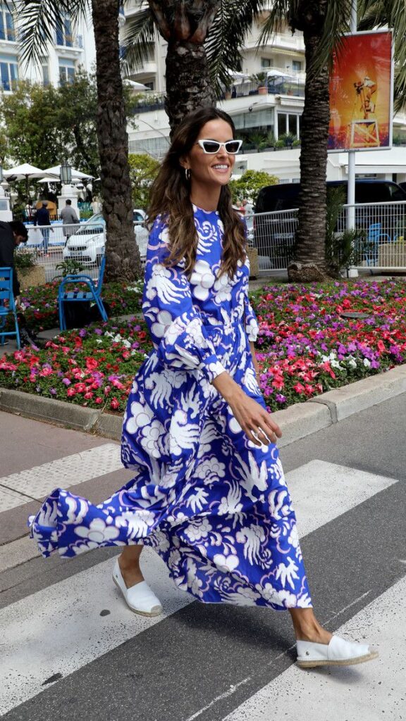 Vibrant, flowy, and effortlessly eye-catching, this blue-and-white printed maxi dress brings high impact without the need for heels. Its dramatic movement and full sleeves speak volumes on their own, so pairing it with simple white espadrilles is both practical and chic.