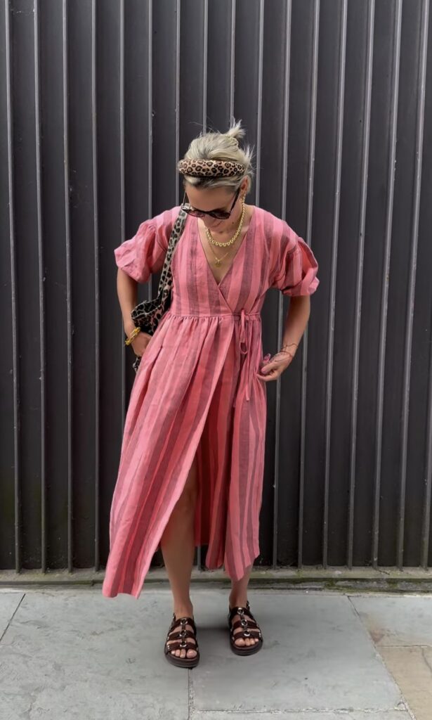 There’s something inherently cool about mixing feminine shapes with rugged footwear, and this look nails the formula. The pink striped wrap dress, with its puffed sleeves and easy silhouette, exudes breezy elegance and comfort. Grounding the look are black chunky flat sandals with bold buckle details—bringing just the right amount of edge to the soft lines of the dress.