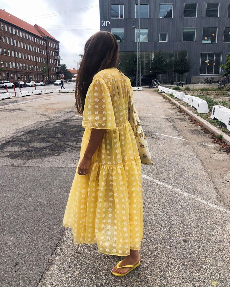 Sunny days call for playful, no-fuss pairings like this cheerful yellow dress and vibrant flip-flop duo. With its voluminous silhouette and delicate white floral embroidery, the dress brings a soft, floaty elegance to the streets. Paired with bold yellow flip-flops, it embraces the carefree spirit of summer while staying effortlessly stylish.