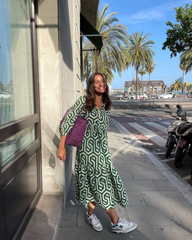 Bold prints meet everyday ease in this fresh and modern pairing. The green-and-white geometric midi dress offers volume, movement, and statement appeal, yet its loose, breezy cut keeps it grounded and wearable. Styled with classic New Balance sneakers, the look takes on a sporty-cool vibe that’s perfect for sightseeing, market runs, or spontaneous adventures.