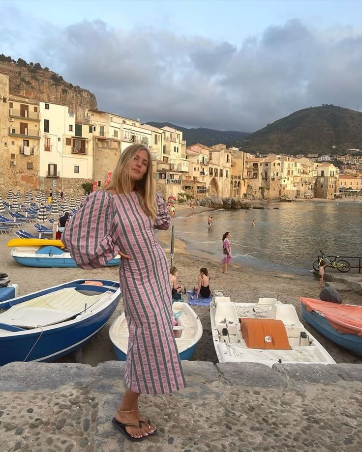 Nothing says coastal ease quite like a relaxed midi dress with volume in all the right places. This pink-and-grey striped number brings the drama with oversized, balloon-like sleeves while maintaining an effortless, straight-cut silhouette. Its minimalist design is elevated by the architectural sleeve shape, making it ideal for seaside dinners or golden hour strolls.