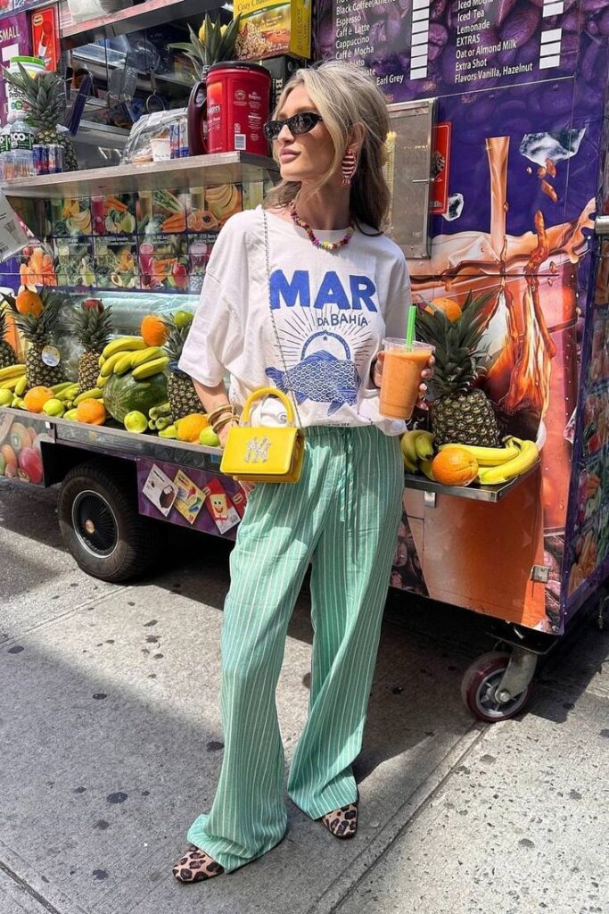 Bursting with personality, this look blends coastal cues with bold street-style sensibilities. The oversized white graphic tee—emblazoned with “Mar da Bahia” and a playful ocean motif—sets the tone with a breezy, beachy vibe. Mint green striped drawstring pants flow effortlessly, echoing the laid-back energy of tropical resortwear while staying city-ready.