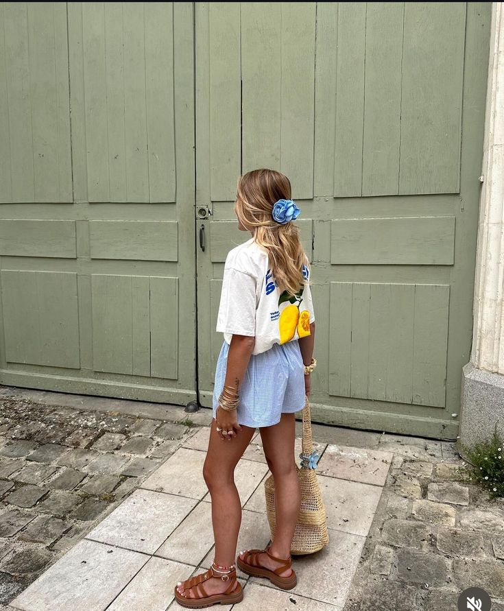 Youthful and sun-soaked, this outfit delivers playful coastal energy with a fresh twist. The oversized graphic tee—featuring a lemon print on the back—adds a quirky, summer-souvenir vibe. Light blue gingham shorts keep the look breezy and sweet, pairing effortlessly with chunky tan sandals for all-day exploring.
