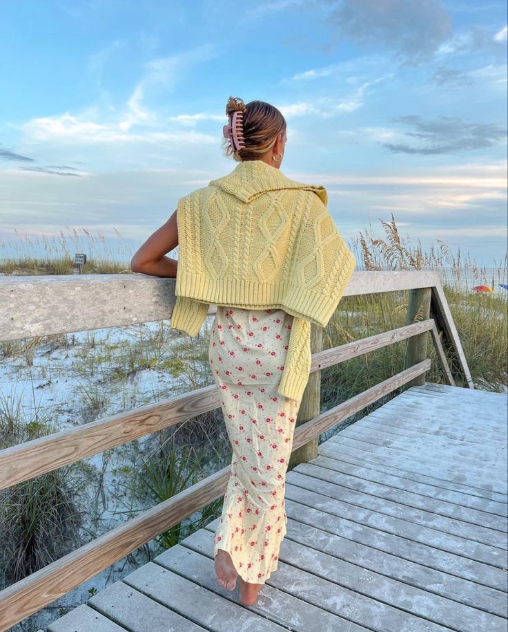 Delicate and dreamy, this look embodies the warmth of a quiet evening by the sea. The soft yellow floral dress skims the figure with a gentle flow, dotted with tiny red blooms that evoke a romantic, vintage feel. Draped over the shoulders is a chunky cable-knit sweater in a buttery hue, ideal for those cool post-sunset breezes.