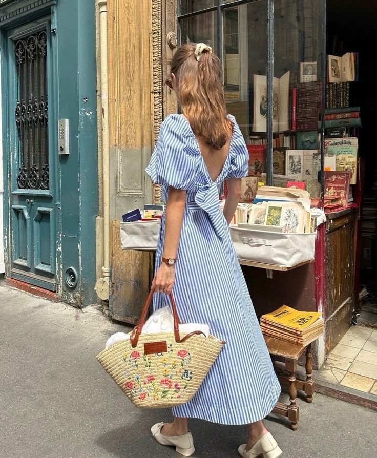 A floral-embroidered straw tote adds a whimsical touch while offering plenty of space for beach reads or fresh finds. White slingback flats and a neutral scrunchie tie the look together with understated elegance. This outfit feels effortlessly refined—like something you’d wear from a coastal brunch to an afternoon bookshop stop.