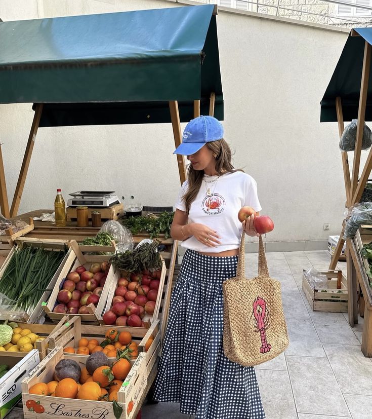 A blue baseball cap lends a sporty-casual twist while balancing out the feminine silhouette. Topped off with a woven tote featuring a bright pink lobster and fruit in hand, this look blends fun and function in true coastal-cool fashion.