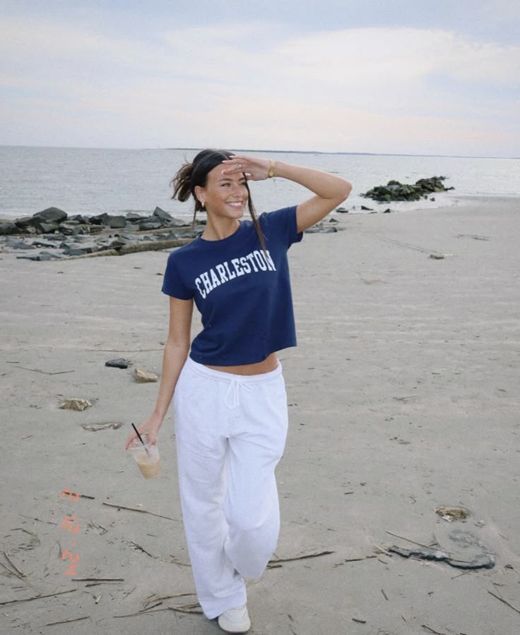 This laid-back look channels coastal cool with an athletic twist. The cropped navy “Charleston” tee gives off collegiate summer vibes, perfectly paired with breezy white drawstring lounge pants that billow softly in the ocean breeze.