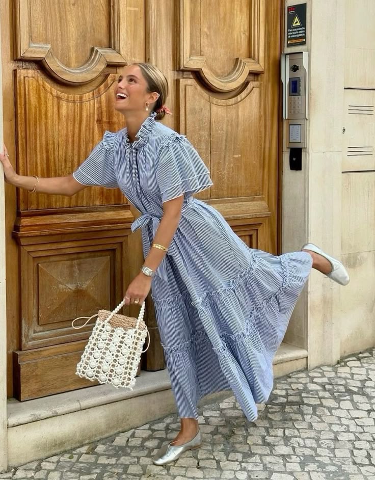 Breezy and beautifully tailored, this tiered striped dress is the picture of coastal polish. The soft blue-and-white pinstripe pattern keeps things classic, while playful details like ruffle trim and puff sleeves add a sense of fun. Tied at the waist for flattering shape and movement, the dress pairs effortlessly with metallic ballet flats that lend just the right amount of shine.