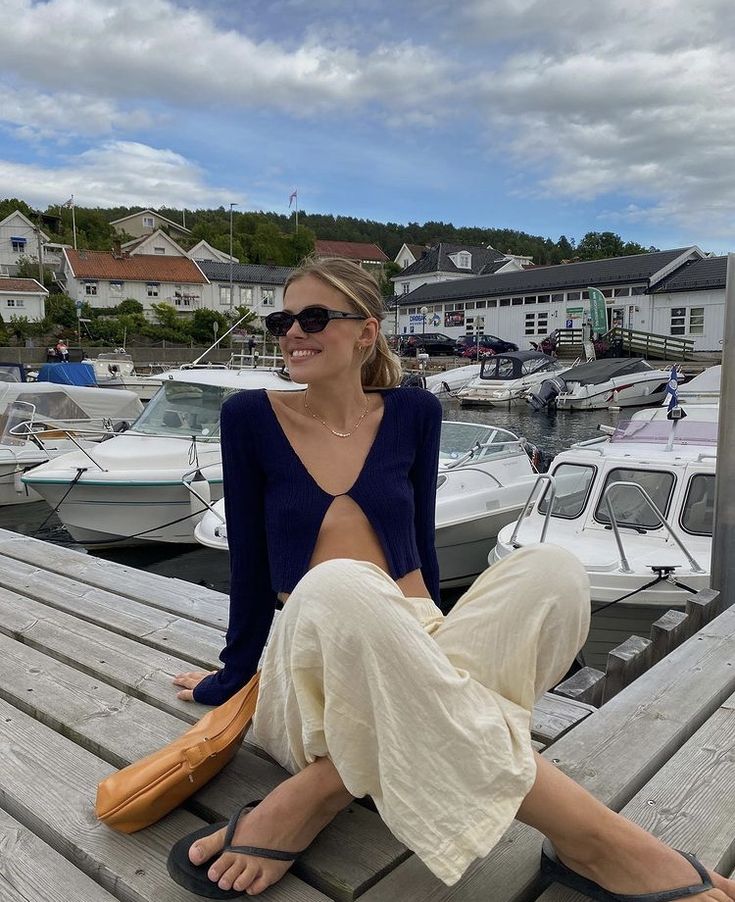 Relaxed yet refined, this coastal look is all about clean silhouettes and quiet confidence. The navy knit top, with its deep neckline and single front clasp, introduces a subtle allure while keeping things simple. Paired with wide-leg, cream-colored linen trousers, the outfit channels that effortless harbor-side elegance perfect for boat days or café lounging.