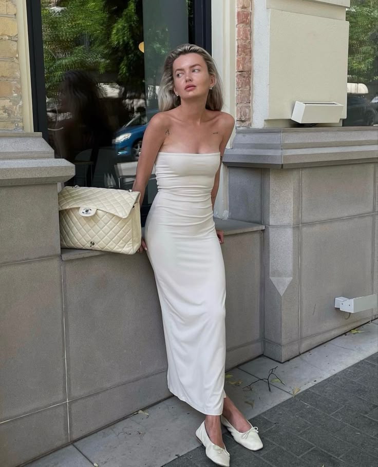 Soft and feminine, this all-white outfit embraces texture and tone for a look that feels classic yet fresh. The strapless white midi dress hugs the silhouette with sleek minimalism, while the pointed white ballet flats with bow detailing bring a vintage-inspired charm that’s both romantic and practical.