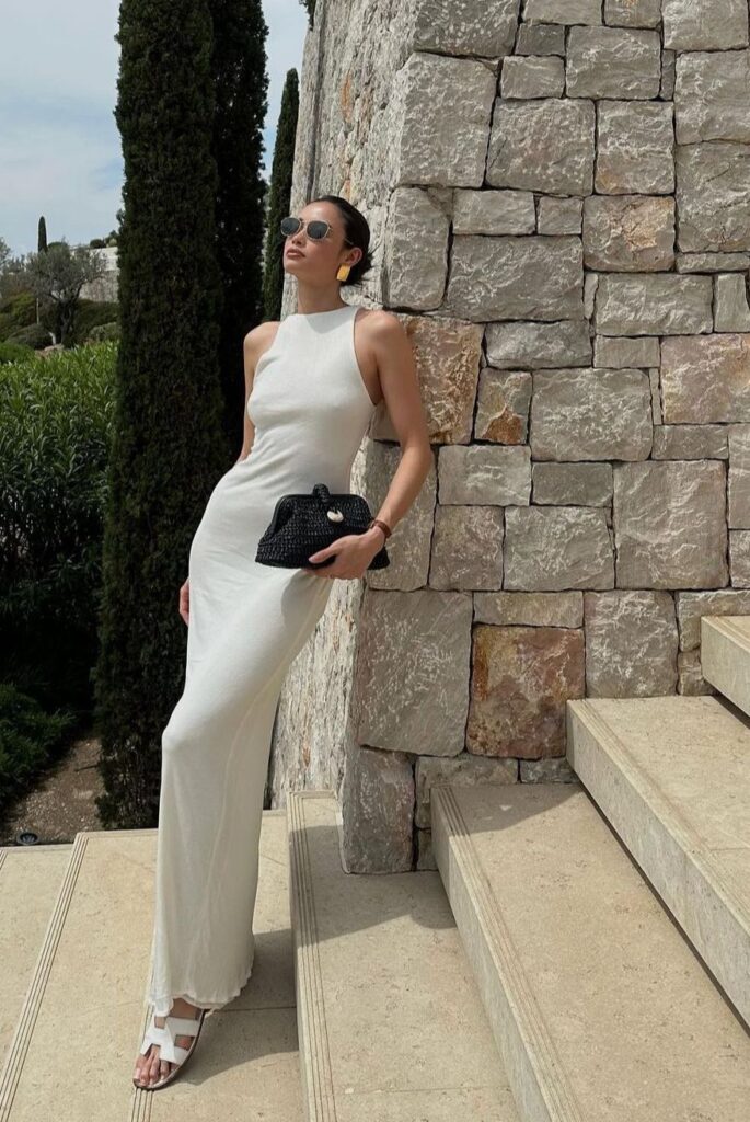 While the sandals maintain the monochromatic palette, it’s the black woven clutch that introduces a gentle visual contrast, adding depth and interest without overwhelming the outfit. Round sunglasses and bold gold earrings punctuate the minimalism with just enough attitude.