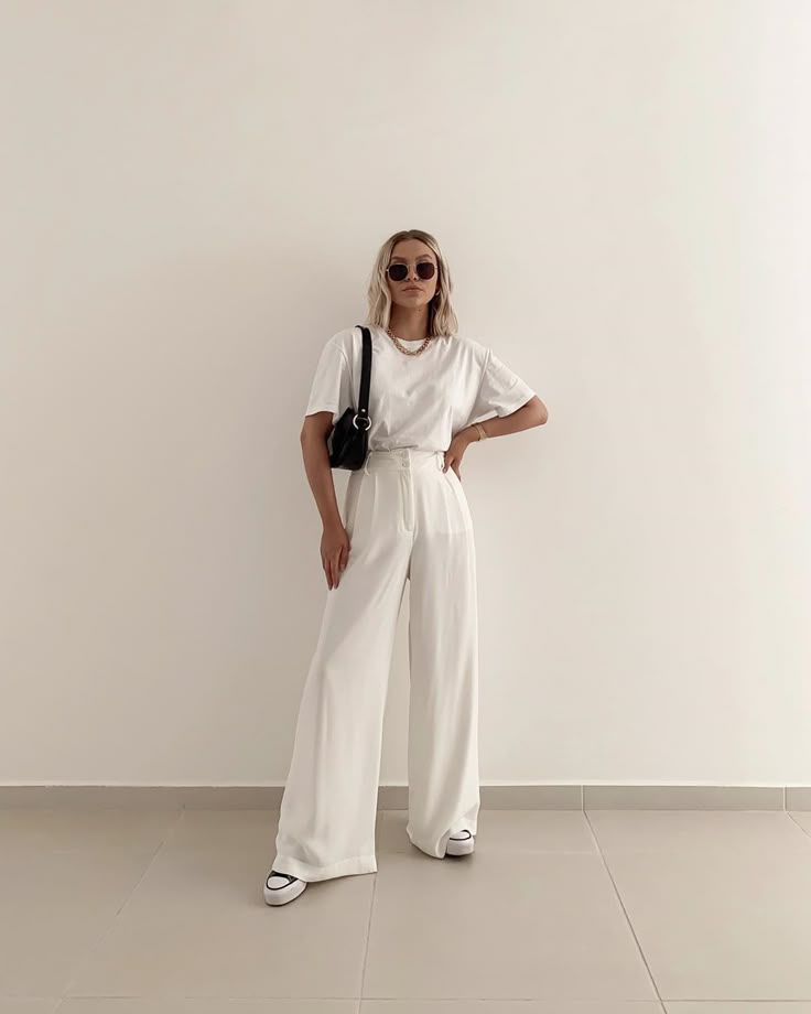 Tailored yet relaxed, this all-white look takes classic minimalism and gives it a fresh, modern edge. Wide-leg trousers and a tucked-in tee keep the silhouette sleek and effortless, while the black-and-white sneakers introduce a sporty, grounded contrast that makes the outfit feel cool rather than clinical.