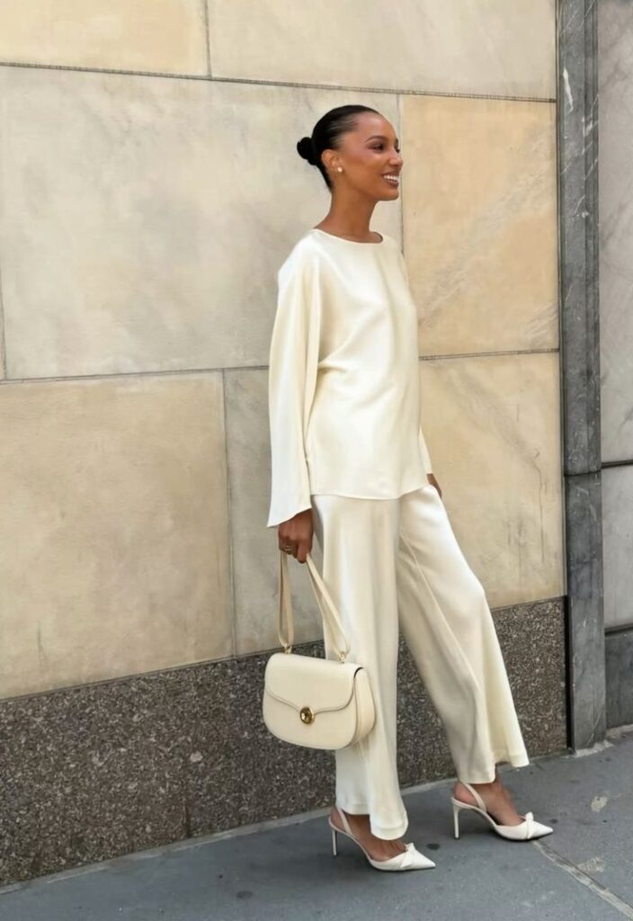 This elegant look embraces the beauty of monochrome dressing with a softly structured satin co-ord that flows with quiet sophistication. The long-sleeve top and wide-leg pants create a luxurious silhouette, enhanced by creamy tones and subtle sheen.