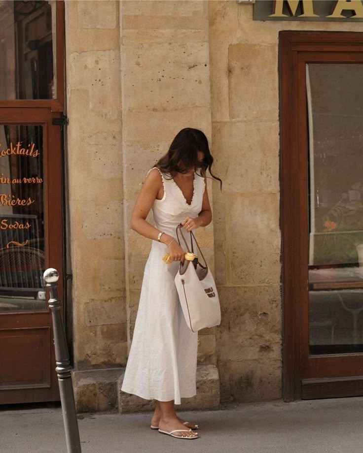 Paired with ultra-minimal white flip-flop sandals, the outfit leans into casual refinement, offering comfort while maintaining its romantic feel. An ivory tote with contrast trim adds structure and practicality, while delicate gold jewelry enhances the look with subtle polish.