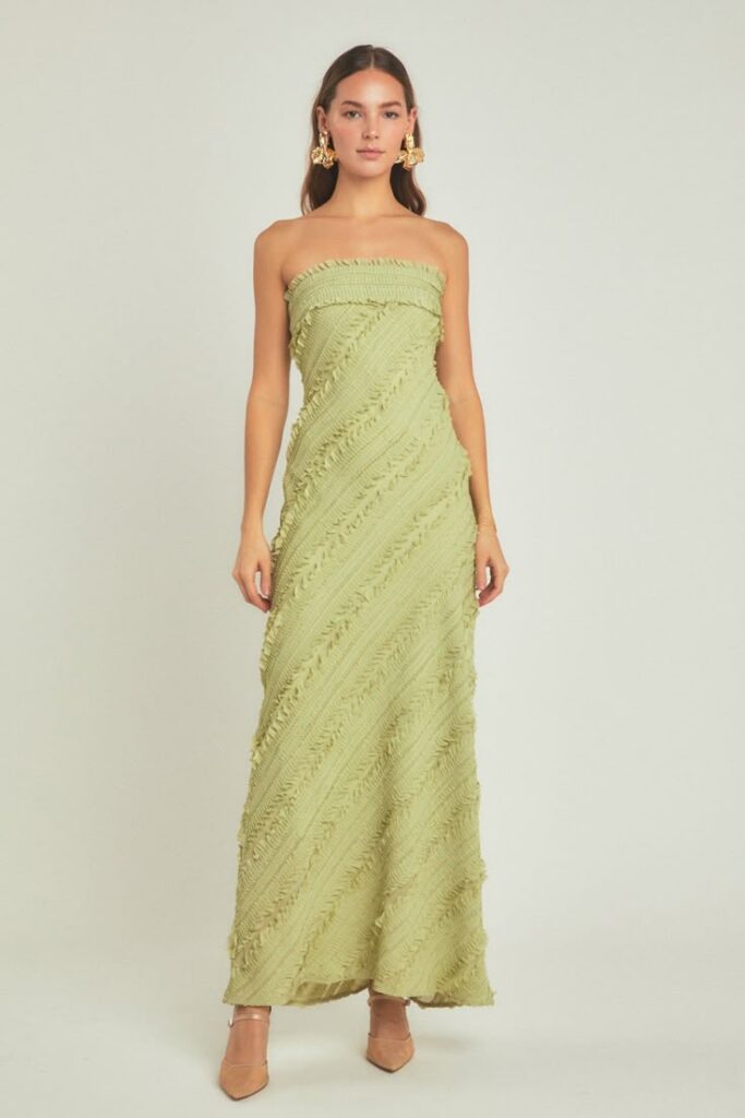 For an ethereal and elongating effect, skin-tone shoes are the perfect choice with a green dress—especially one as textured and striking as this strapless gown. Nude or beige heels seamlessly blend with your legs, allowing the dress to take center stage without distraction.