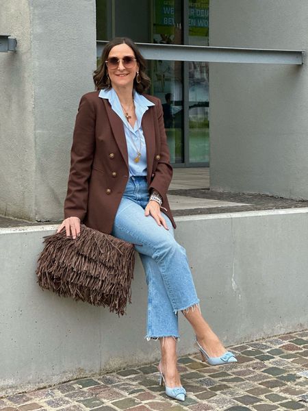 This look blends timeless tailoring with a playful twist. The chocolate brown double-breasted blazer adds structure and warmth, layered effortlessly over a powder blue blouse for a fresh pop of color. Light-wash cropped denim brings casual balance, with raw hems that keep the outfit from feeling too buttoned-up.
