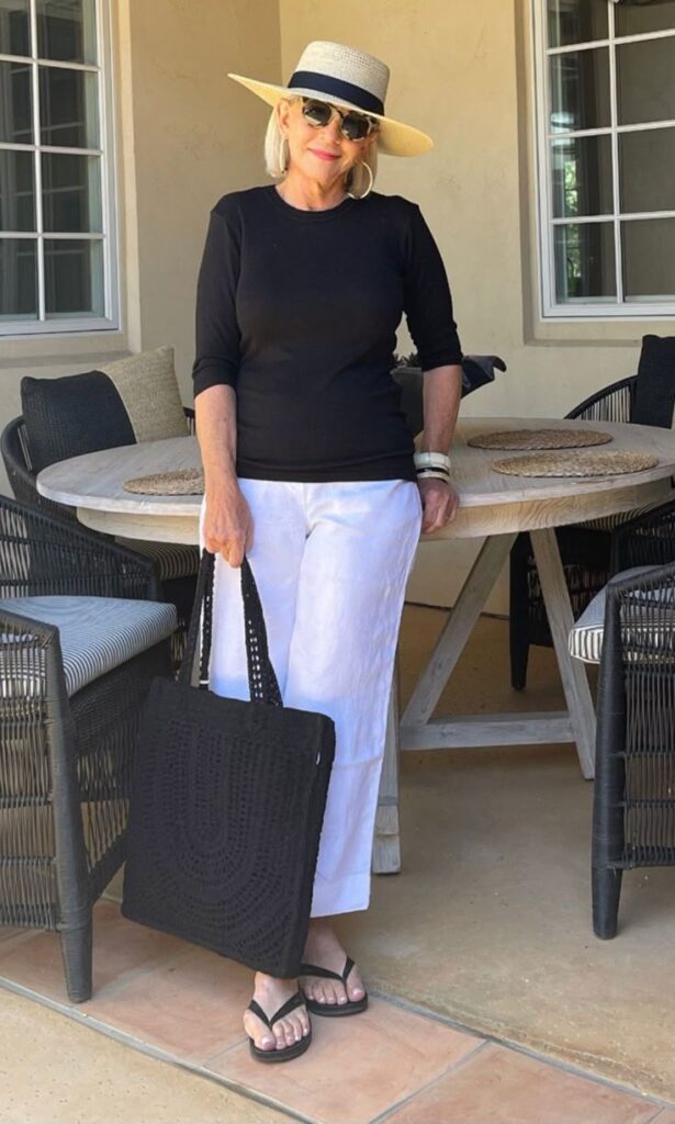 Black and white never go out of style, and this breezy ensemble proves why. A fitted black top is balanced by relaxed white linen trousers, creating a clean palette that’s easy and sophisticated. The black woven tote and sandals echo the top for visual cohesion, while the straw hat adds texture and sun-smart flair.
