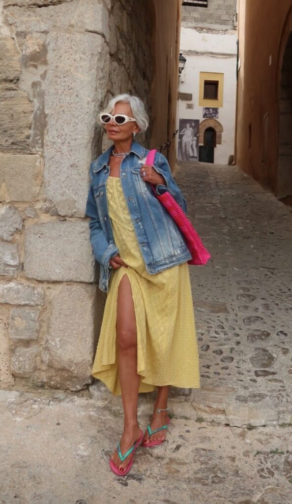 Effortlessly sunny and playful, the lemon-yellow midi dress with a front slit exudes carefree summer charm. The denim jacket adds structure and casual cool, perfect for breezy Mediterranean strolls. A pop of fuchsia from the woven tote injects youthful energy, echoed subtly by the vibrant flip-flops in bold pink and turquoise.