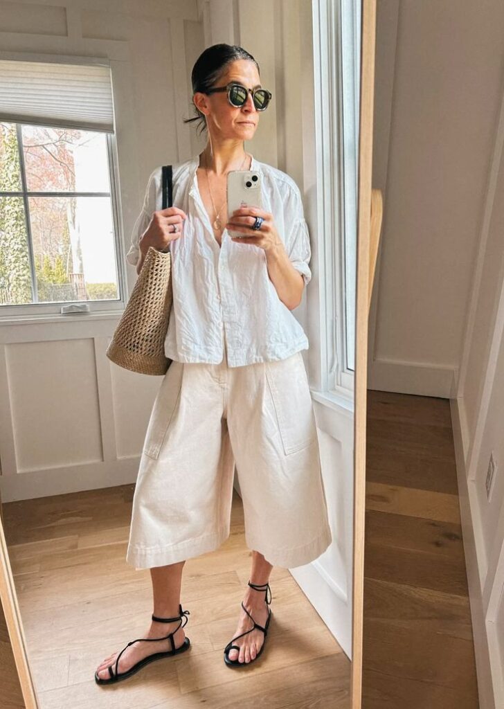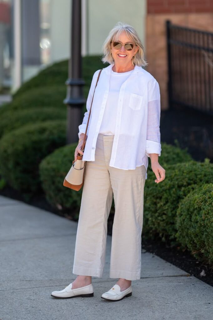 Neutral-toned linen separates are a quiet staple in the Parisian wardrobe—especially for women who master effortless style beyond 60. The soft, slightly crinkled button-down shirt paired with wide, cropped trousers delivers a look that feels both breezy and refined.