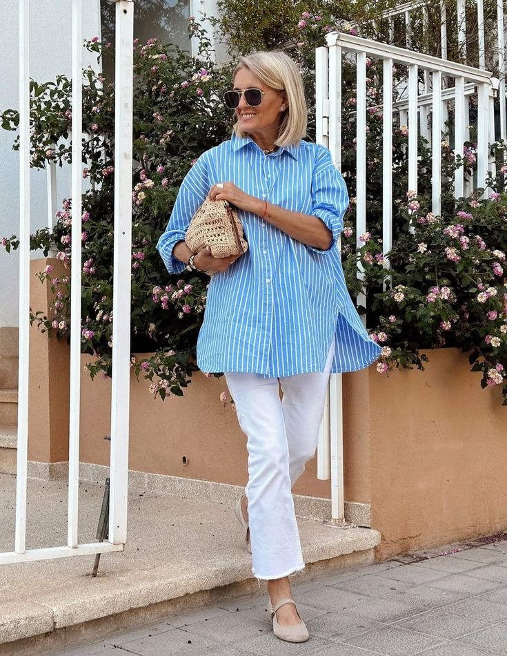 Striped shirts are having a major moment—especially in oversized cuts that effortlessly blur the line between crisp and relaxed. Paired here with slim white jeans and delicate Mary Jane flats, the look is fresh, refined, and quietly bold.