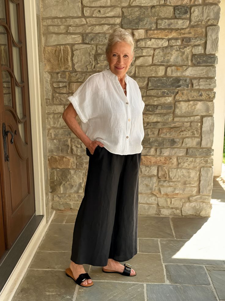The soft drape of the linen and the cropped pant hem offer both comfort and elegance, while the black slide sandals add a modern finish. It’s a formula that proves style over 60 can be elevated and endlessly repeatable without ever feeling overdone.