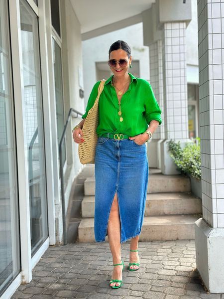 This outfit captures Parisian-inspired chic through bold color and streamlined pieces. The vivid green blouse brings fresh energy to the look, tucked neatly into a classic denim midi skirt with a front slit for subtle allure. Coordinating green sandals and a matching designer belt add polish and cohesion.