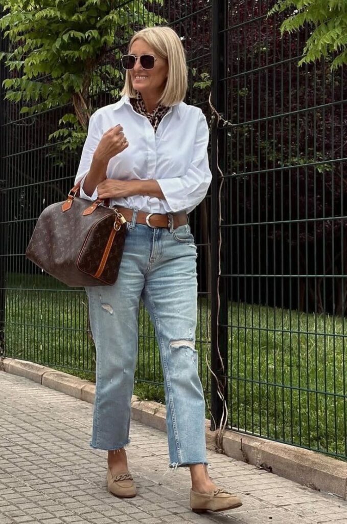 Button-downs aren’t just a wardrobe staple—they’re a Parisian essential, especially when paired with laid-back denim. The blend of a structured white shirt and relaxed, lightly distressed jeans gives this outfit its casual cool without feeling careless.