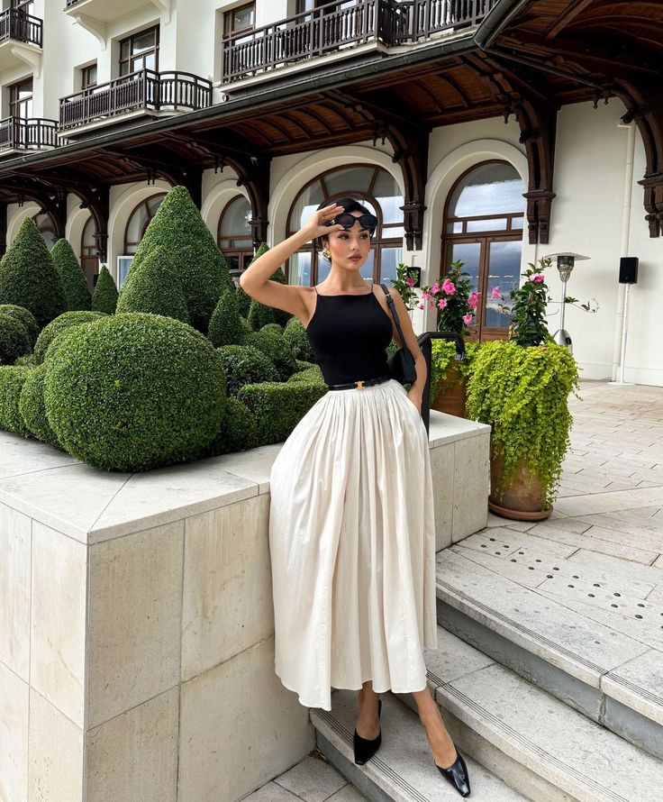 Straight from the pages of a European style diary, this outfit is timeless sophistication done with minimalist finesse. The pairing of a sleek black tank with a voluminous ivory midi skirt creates a high-contrast silhouette that’s both sculptural and feminine.