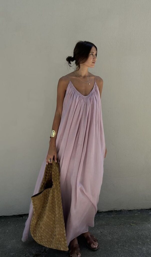 Few things rival the graceful charm of a billowy sundress, especially in a soft lavender hue that evokes the pastel walls of a Greek island or a Provençal evening sky. This breezy, floor-length number flows with an effortless silhouette, skimming the body while allowing the air to move freely—perfect for warm summer strolls.