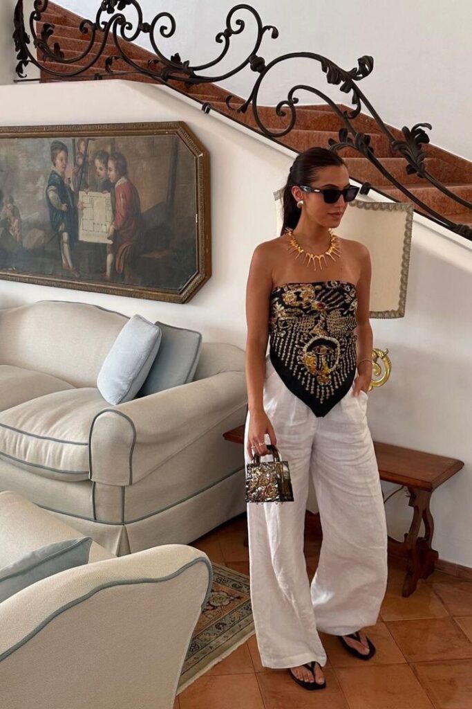 A printed scarf top worn as a bandeau instantly channels the sultry elegance of the Amalfi Coast. Paired with relaxed white linen trousers, this outfit is light and airy yet delivers major style impact. The gold statement necklace adds drama and echoes the luxurious print of the top, while the dark tortoiseshell mini bag gives it a polished finish.