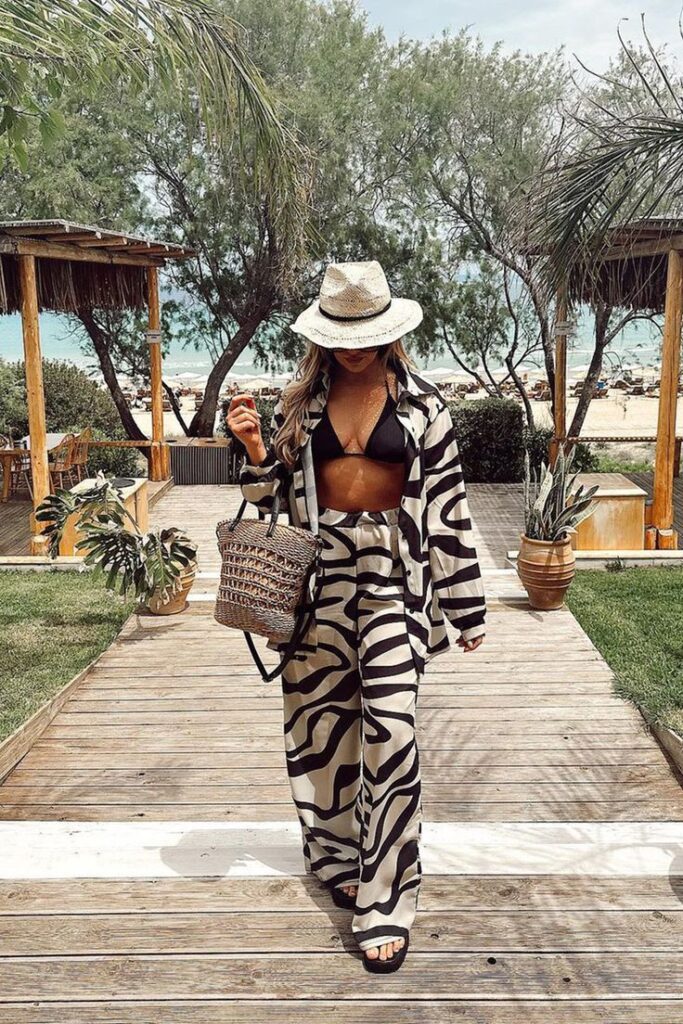 Bold and breezy, this zebra-print co-ord channels high-fashion glam with a relaxed Mediterranean spirit. The oversized shirt paired with wide-leg trousers makes a statement while staying beach-appropriate, layered effortlessly over a sleek black bikini.