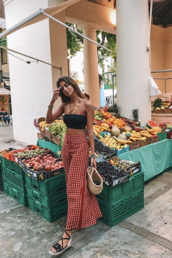 Strolling through a local fruit market never looked so stylish. A simple black bandeau top keeps the silhouette sleek, while the high-waisted red patterned palazzo pants add a burst of energy and Mediterranean charm.